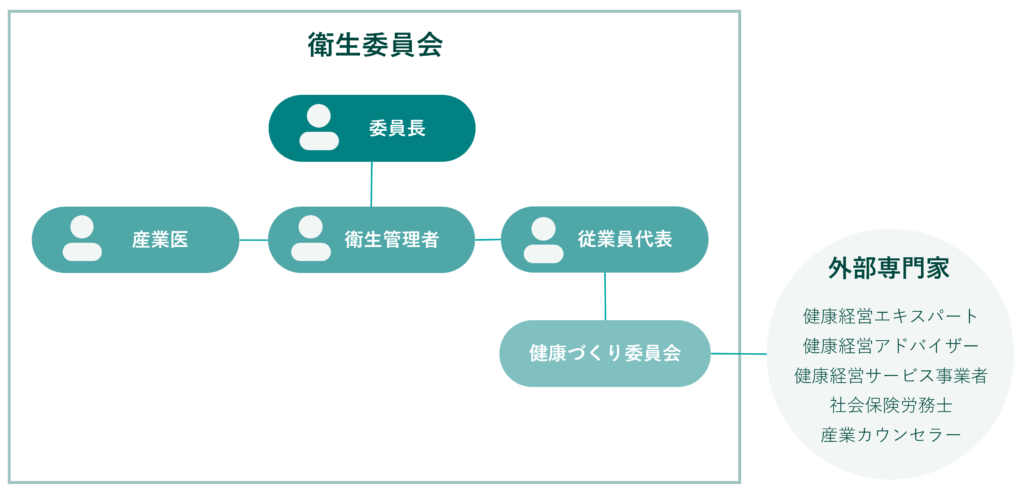 外部機関や専門家と連携しながら、健康づくり委員会が中心となり、健康宣言、方針、目標を具体的な取組みとして推進しています。