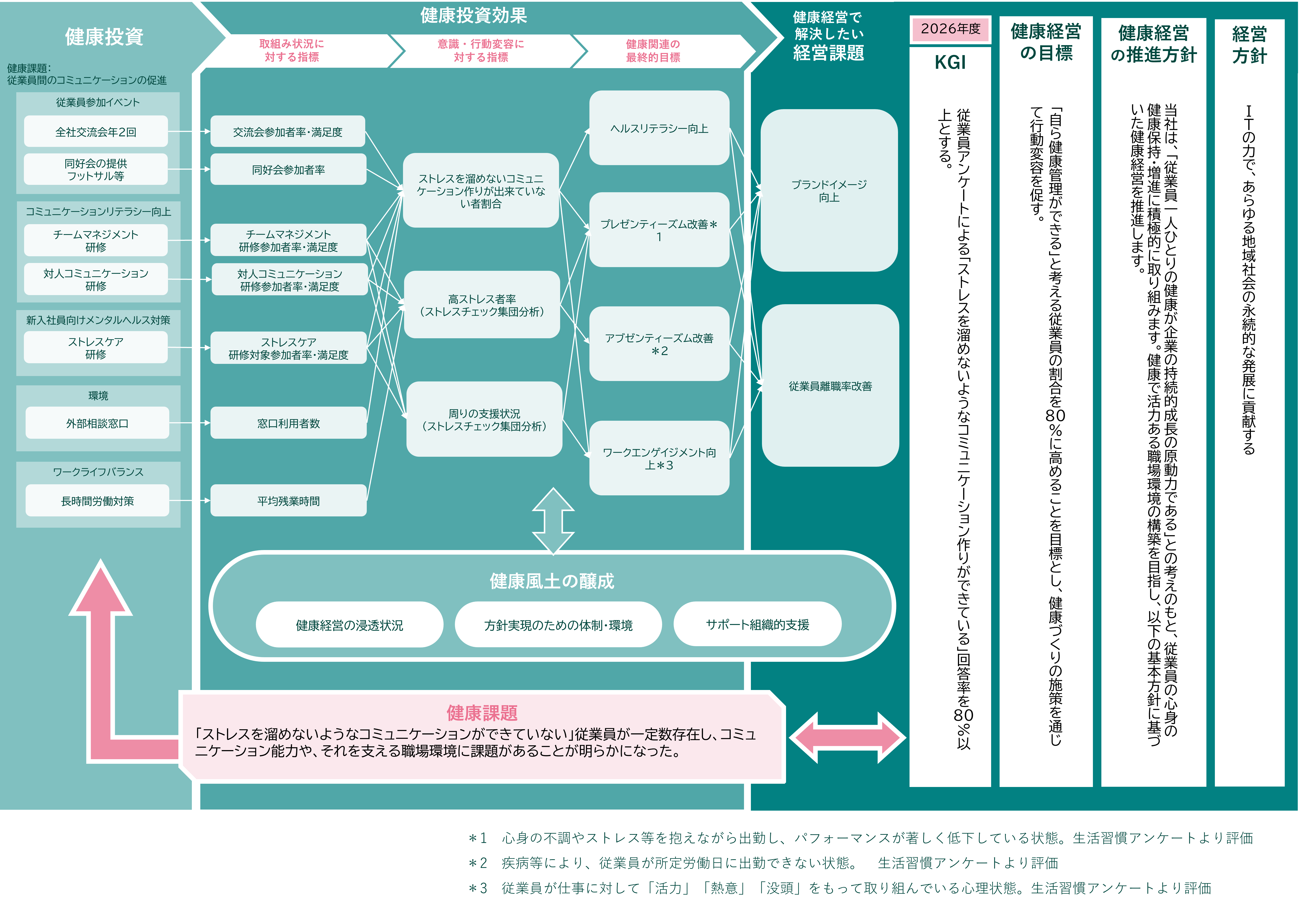 従業員の健康投資と健康づくり施策の推進は、企業の経営課題の解決に直結する重要な取り組みです。当社では、このストーリーの全体像を「健康経営戦略マップ」として展開し、具体的な戦略を明確化しています。