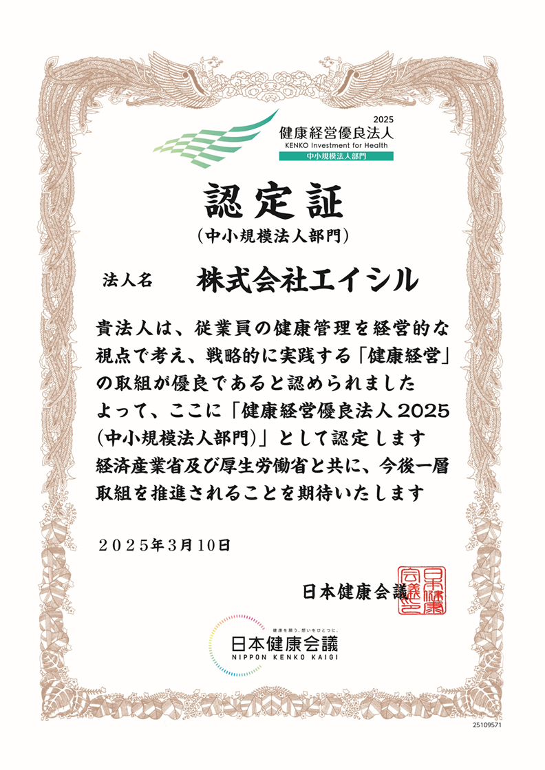 株式会社エイシルは経済産業省と日本健康会議が主催する健康経営優良法人認定制度において、社員の健康管理を経営的な視点で考え、戦略的に実践する健康経営の取組が優良であると認められ、「健康経営優良法人2025」の中規模法人部門に認定されました。